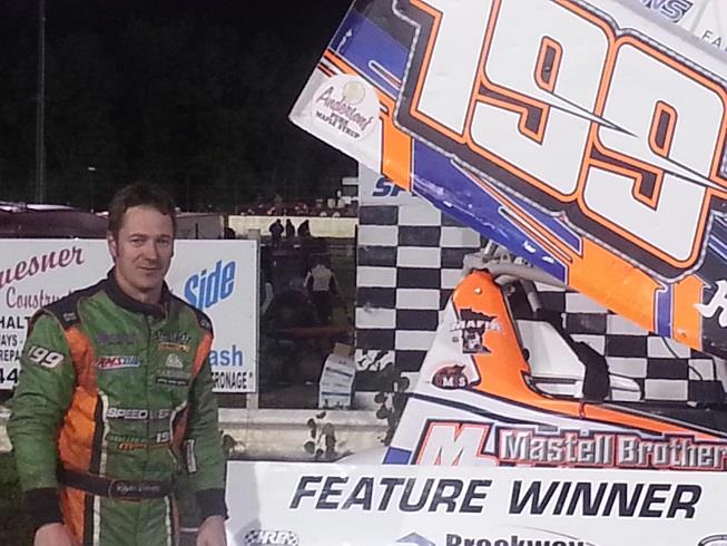 (Bill W) September 11, 2014 – Ryan Bowers made his first ever appearance with the Brockway Mechanical & Roofing Sprint Invaders count. The Ham Lake, Minnesota native took the lead in the late going and held on for the $1,500 win at Farley Speedway in Farley, Iowa early Friday morning as part of the Yankee Dirt Classic. His win came aboard the Mastell Brothers Racing #199.